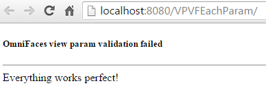 You can customize HTTP error pages via <error-page/> entries in web.xml. Otherwise the server‐default one will be displayed instead. If we skip the message attribute, then OmniFaces will use the default error messages (e.g. in the above use cases, the messages indicated via validatorMessage attribute). If we attach <o:viewParamValidationFailed/> “locally” to view parameters and “globally” to <f:metadata/> also, then the “global” <o:viewParamValidationFailed/> will be evaluated only if none of the “local” <o:viewParamValidationFailed/> has already handled the validation error.