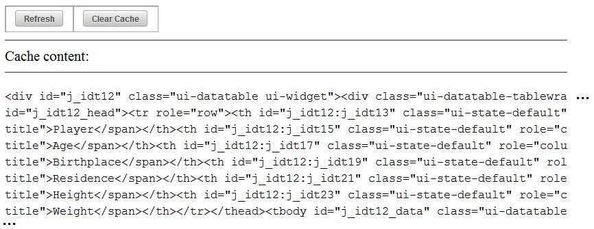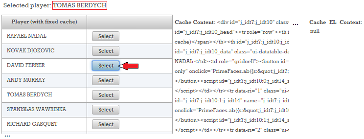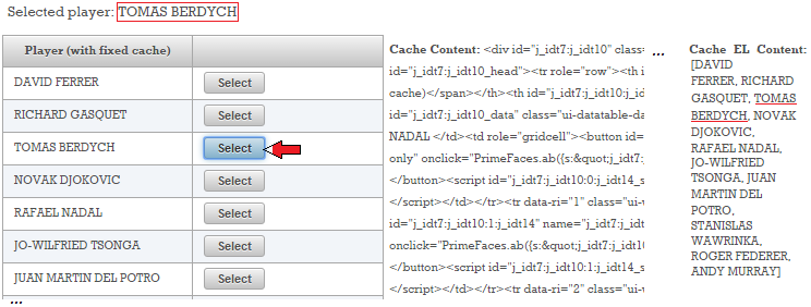 We did multiple selections until the above screenshot was taken. The Cache Content doesnʹt change (even if we shuffle the collection that feeds the table, its markup comes from cache), the Cache EL Content is null (since we didnʹt use <o:cacheValue/>) and the current selection (indicated by the red arrow) doesnʹt match the selected player! Obviously, this is not correct. Now let’s adjust the code to cache the #{playersBean.data} expression: