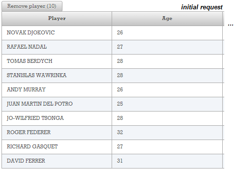 Let’s suppose that we have a static table that lists tennis players from ATP. See figure below (this table is produced via a simple usage of the <p:dataTable/> tag):