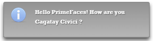 This time let’s complicate things a little. So far, the hello() method returns a simple message, Hello! How are you ?. Furthermore, we want to return a customized message such as Hello PrimeFaces! How are you Cagatay Civici ?. Moreover, the PrimeFaces and Cagatay Civici will be parameters sent via JavaScript function and received in a managed bean via a request parameter map. For this, we will use the below adapted managed beans: