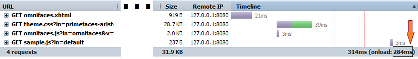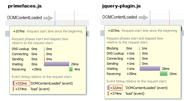 As a live example, check the bottom of </body> of the ZEEF site. All essential PrimeFaces-related scripts and some site-specific scripts are combined in the first deferred script and all non-essential social media related scripts are combined in the second deferred script. As to performance improvement of ZEEF, on a test JBoss EAP server on modern hardware, the time to DOMContentLoaded went from ~3s to ~1s.