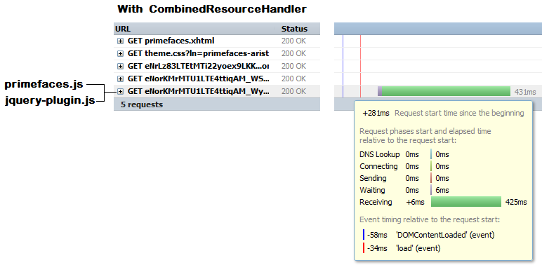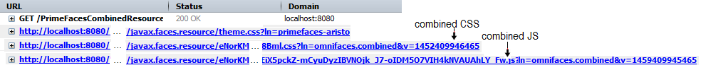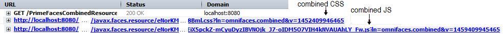 Earlier in this chapter we talked about CombinedResourceHandler, so there is no need to introduce it again. The topic of this section is focused on using CombinedResourceHandler with <o:deferredScript/>. The CombinedResourceHandler will transparently recognize and combine the deferred script resources into a single resource as well. So once you set up the CombinedResourceHandler in your faces-config.xml the OmniFaces will do the rest. For example, let’s consider our deferred scripts from the previous section: