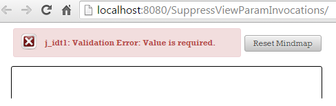 http://localhost:8080/SuppressViewParamInvocations/). In this case, we see the error message caused by the built-inrequiredvalidator,j_idt1: Validation Error: Value is required.. This is the expected behavior: