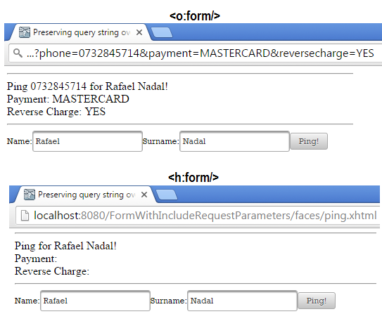 Notice the presence of <o:form/>. Each time you press the Ping! command button, you can see that the query string (?phone=0732845714&payment=MASTERCARD&reversecharge=YES) is preserved in the URL. By default, the JSF <h:form/> will loose the query string at first postback! This is not always desirable (see below the effect of a postback with <o:form/> and with <h:form/>):
