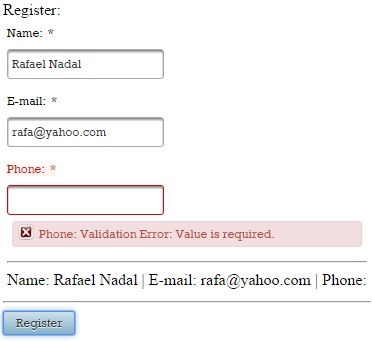 Notice in the picture below that the name and e-mail were successfully passed into the data model even if the phone field caused a validation error. The validation error message is displayed, but the validation phase was successfully “passed” even if the validation failed: