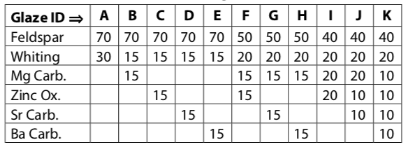 Study this table for a moment to see how we can start with the flux materials in the 0.7 Limestone Set (ID.”A”) and replace the feldspar and whiting with other flux materials - e.g. in “B” to “E” we are replacing half the whiting. The rest illustrate some of the feldspar being replaced as well. As we study this it becomes evident that this represents a very small proportion of the possible combinations; it becomes obvious that the possibilities are almost endless.