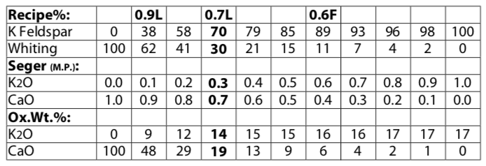 The first thing to change is the relative proportions of these two fluxes; we can go from one extreme where the only flux is \(K_{2}O\) (potash) to the other where the only flux is \(CaO\) (lime). The recipe for Glaze C in the 0.7 Limestone Set is 70% potash feldspar + 30% whiting. We would vary the proportion of feldspar-to-whiting to go from one extreme to another. The Limestone/Feldspar Series Table (page 46) shows the flux oxides and flux materials in Glaze C for a range of sets. Looking at the top 2 rows of figures, we can see that Glaze C goes from 100% whiting to 100% potash feldspar.