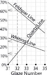 Five glazes occur at equal intervals along the horizontal axis. If for example we wish to get the recipe for Glaze 32, we follow the dotted line up from 32 and see at what % it intersects the three sloping lines. We read the % figures at the arrows:
