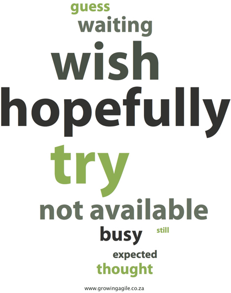 We have created a list of “impediment words”. Listen for these words in your next daily scrum and see how many potential impediments you can spot. Ask clarifying questions to uncover whether it is a problem, or if someone is just using uncertain language out of habit. Start to notice how often you and those around you use uncertain language.