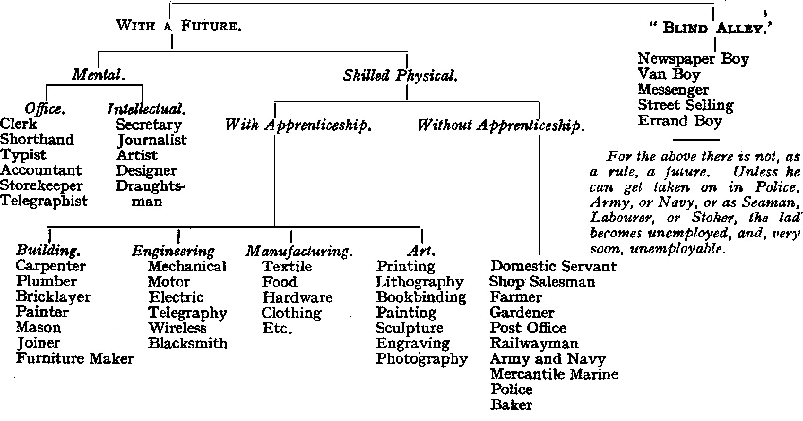 In the first place, he should discriminate between those employments which offer a future to the boy and those which lead to nothing (so-called “Blind-Alley jobs”). These latter often bring in good money for the time being, to increase the weekly income of the family, and are, therefore, adopted for the boy by the parents regardless of the fact that they give no opening to him for a man’s career afterwards.