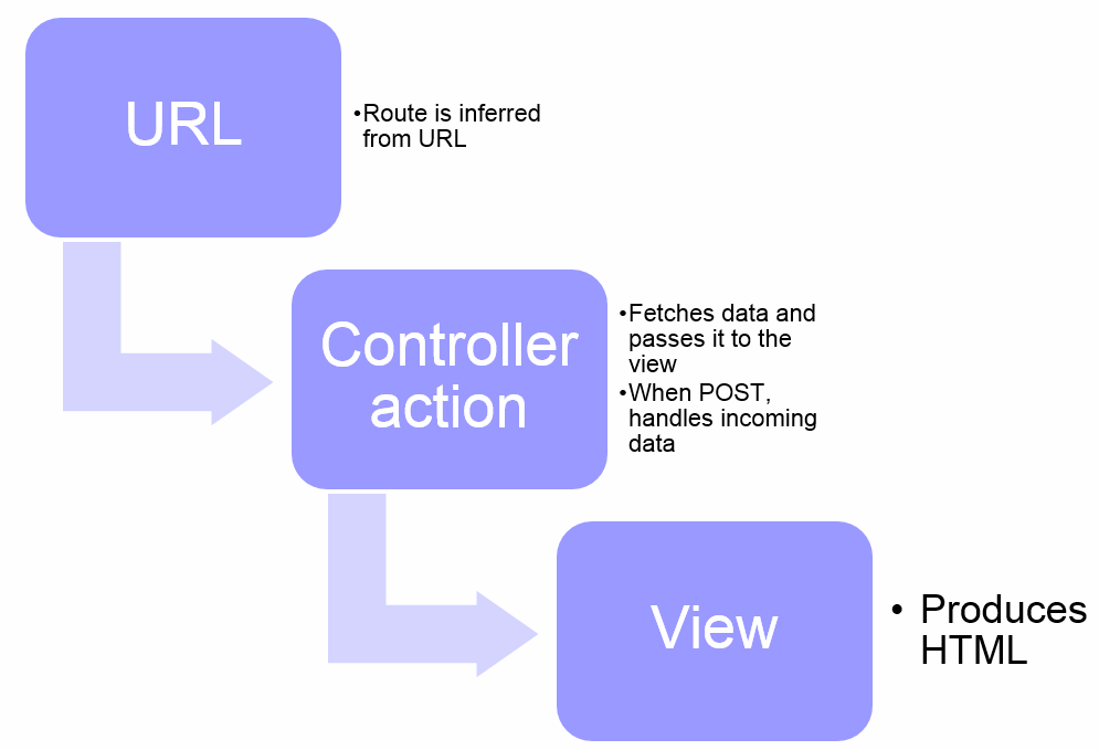 When our browser queries an ASP.NET MVC URL, there are three elements that work together in order to produce an HTML page: