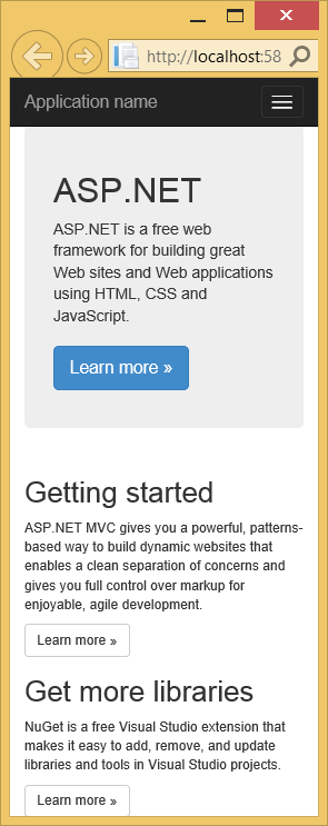 That application also has a menu above, with links that take me to almost empty “About” and “Contact” pages. Also note that we already have fully-functional “Log in” and “Register” links for user authentication. If I use them, a local SQL Server database will be created and used for storage.