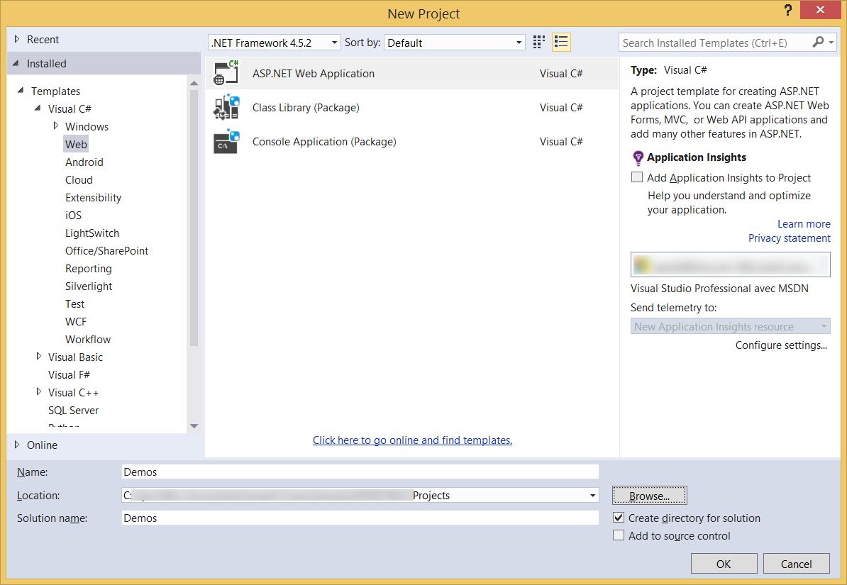 From the left menu I’ll select Visual C# since it’s the most common coding language for .NET, then Web. In the middle pane I’ll select ASP.NET Web Application and in the right pane I’ll ensure the Add application Insights to Project is unselected (because I don’t need them). In the lower part of the dialog box I’ll type the name of my project: Demos.