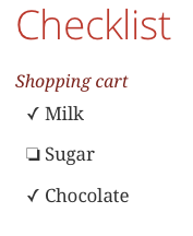 Creating a list with Asciidoctor markup is easy. To create an unordered we need to start a line with an asterisk (*) or hypen (-). We can add some extra markup to create a checked list. If we add two square brackets ([]) to the list item we have a checklist. To have an unchecked item we use a space, for a checked item we can use a lowercase x (x) or an asterisk (*).