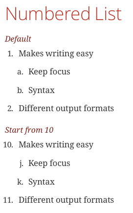 To write a (nested) ordered lists in Asciidoctor is easy. We need to start the line with a dot (.) followed by a space and the list item text. The number of dots reflects the levels of nesting. So with two dots (..) we have a nested list item. By default each nested level has a separate numbering style. The first level has arabic numbering, the second lower case alphanumeric, the third upper case alphanumeric, the fourth lower case roman and the fifth (which is maximum depth of nested levels in Asciidoctor) has style upper case roman. But we can change this by setting a block style for each nested level block. The name of the block style is arabic, loweralpha, upperalpha, lowerromann or upperroman. With the HTML5 backend we can also use decimal and lowergreek.