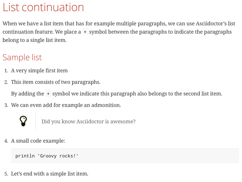 When we write a list in Asciidoctor we can simply create a list item by starting the line with a dot (.). To create a another list item we simply start a new line with a dot (.). But what if we want to add a list item with multiple paragraphs, or text and a source code block element. We can use the list item continuation (+) to indicate to Asciidoctor we want to keep these together for a single list item.