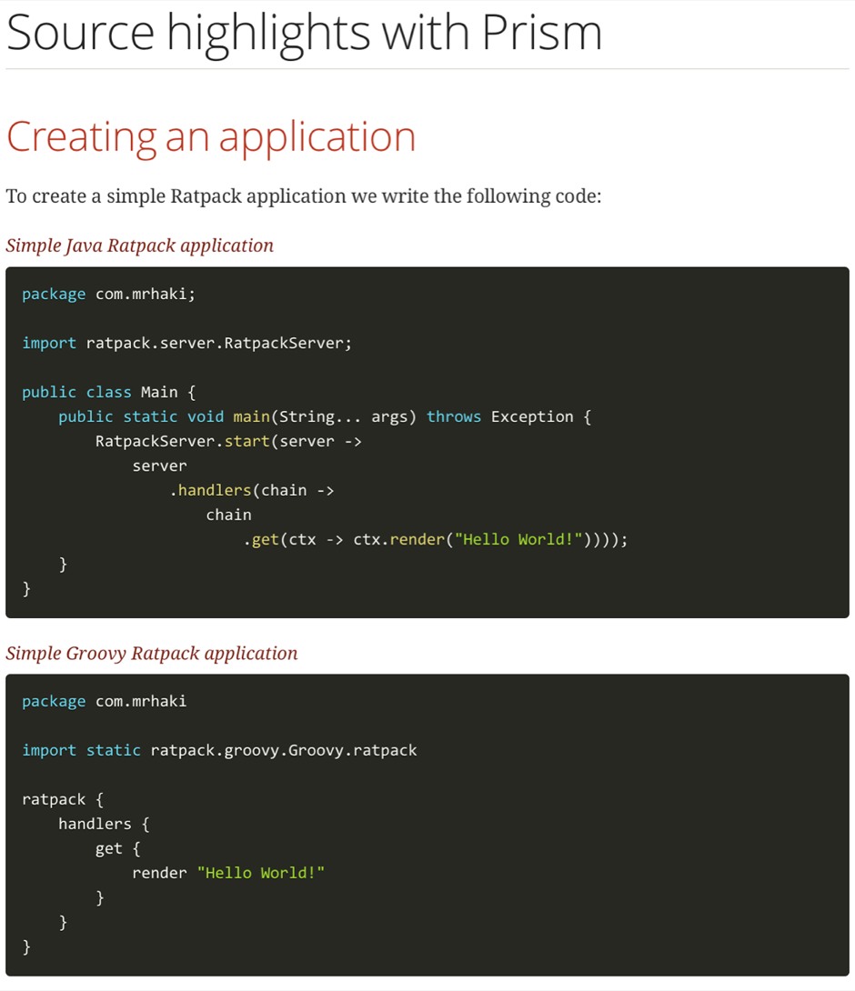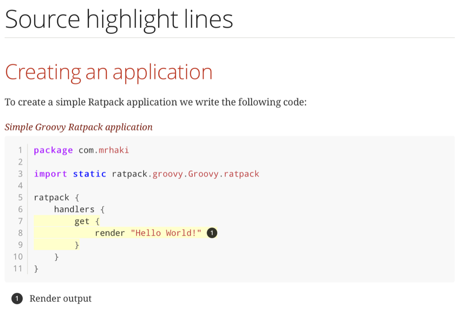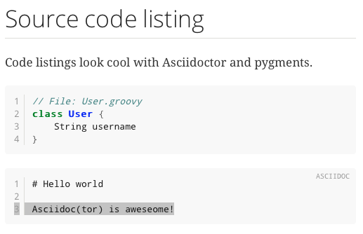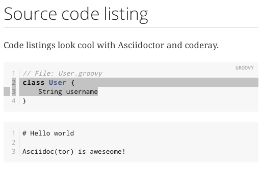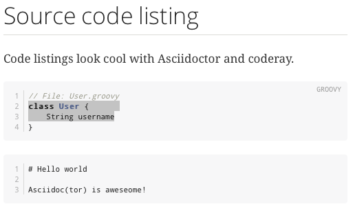 This will result in the following HTML if we use Asciidoctor with the pretty-print syntax highlighter: