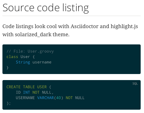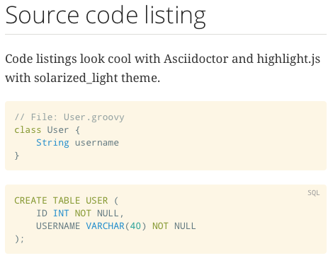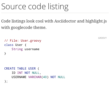 Code listings look cool with Asciidoctor and highlight.js with {highlightjs-theme} theme.