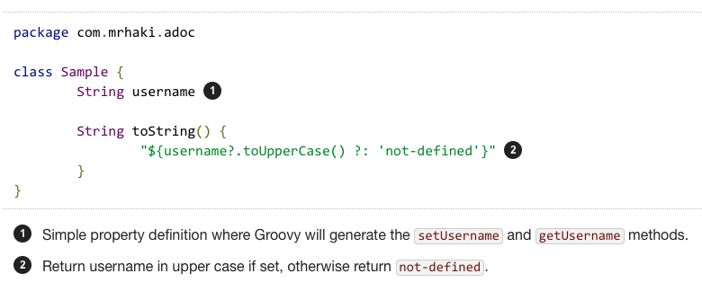 Writing documentation with Asciidoc is such a treat. We can add markers to our code where we want to explain something in our code. The markers have numbers and are enclosed in < and > brackets. The explanation for the markers follows a code listing in a callout list. Here we use the same marker and add extra text to explain the code. We can put the markers in comments in our code so we can use the markers in existing code.