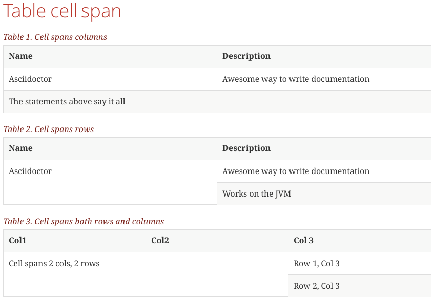 In the following example Asciidoctor markup we have three tables. In the first table we span a cell over 2 columns, the second table spans a cell over 2 rows and in the final table we span a cell over both 2 columns and rows.