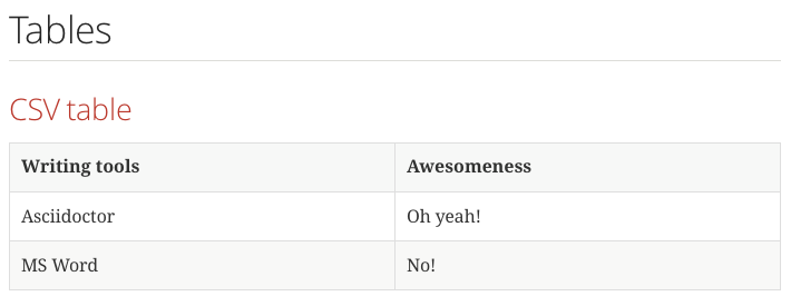 With Asciidoctor we can create tables where the header and rows are in CSV (Comma Separated Values) and DSV (Delimiter Separated Values) format. Normally we use a pipe-symbol (|) to separate cell values. This is actually PSV (Prefix Separated Values) :-).