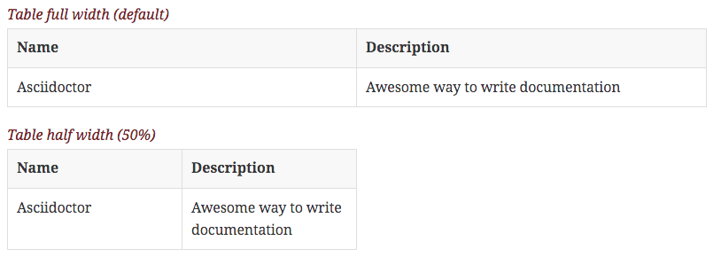 We see in the examples that the width of the table is the same as the width of the page. To make a smaller table we set the width attribute for a table. The value must be a percentage. Let's create a sample Asciidoctor file and define a table with a width of 50%: