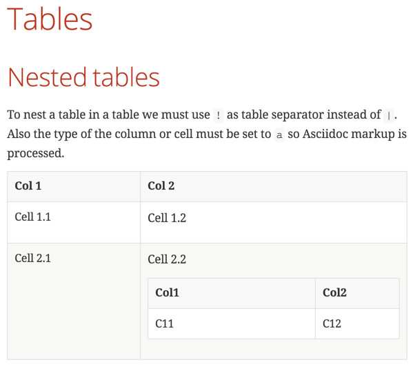Defining tables in Asciidoctor is very easy. The start and end of the table are defined by |===. But if we want to add a new table to a table cell we cannot use the same syntax. To define a nested table we must replace the | separator with !. So instead of |=== to indicate the table boundaries we use !===. Also the cell separators are now ! instead of |. Finally we must make sure the table cell or column supports Asciidoc markup, so the table is properly created. We must configure the cell or column with a so the nested table is created.