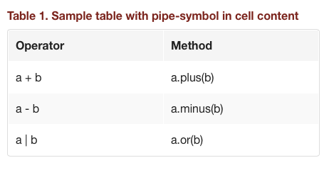To define a table in Asciidoc is easy. Table cells are separated basically by pipe symbols (|). But if we want to use a pipe-symbol as cell content we need to escape the pipe-symbol with a backslash (\)