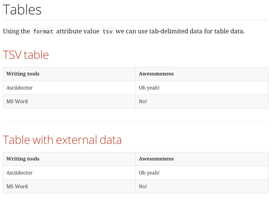 In a previous post we learned how to use data in CSV and DSV format. Recently we can also include tab separated values (TSV) in a Asciidoctor table. We must set the table attribute format to the value tsv. The data can be inside the document, but also defined in an external file which we add with the include macro.
