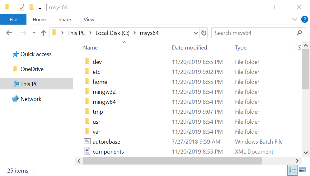 Figure 2-6 shows an Explorer window. The address bar equals This PC > Local Disk (C:) > msys64 there. It matches the C:\msys64 absolute path. Thus, we see the contents of the msys64 directory on the C drive in the Explorer window.