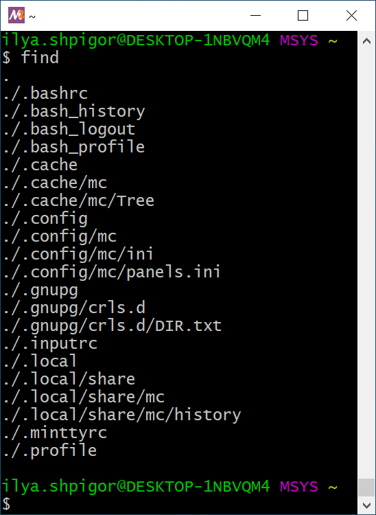 The first line starts with the username. The username is ilya.shpigor in my case. Then there is the @ symbol and the computer name DESKTOP-1NBVQM4. You can change the computer name via Windows settings. The word MSYS comes next. It means the platform where Bash is running. At the end of the line, there is the symbol ~. It is the path to the current directory.
