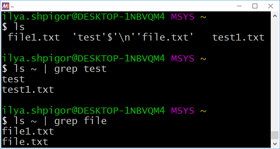 ls and grep utilitiesBoth commands truncate the test\nfile.txt filename.