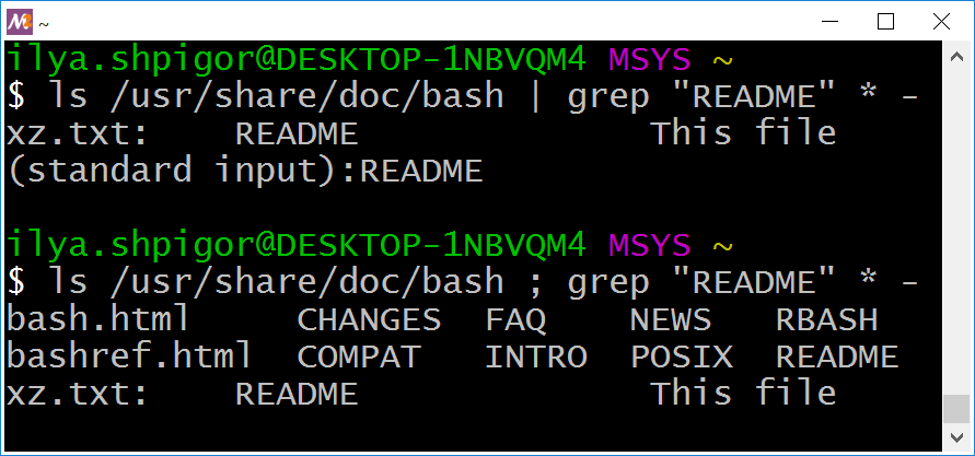 When using the semicolon, the ls utility prints its result on the screen. Then Bash calls the grep utility. It processes all files of the current directory. Next, grep checks its input stream. There is no data there. This way, grep finds the “README” word in the xz.txt file only.