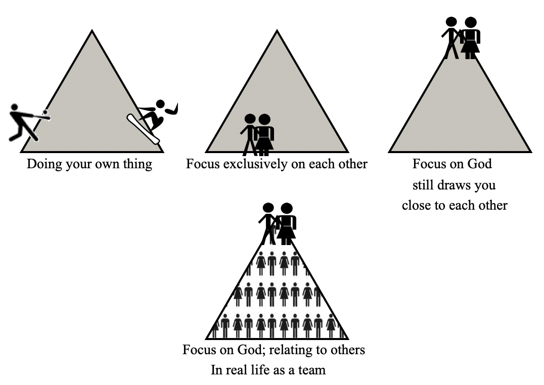 It is my prayer that this would be a time of joy and not of undue stress. Look to the Lord, your Joy-Giver, throughout the process. As pictured on the following triangle, the closer you draw to God, the closer you will draw to each other. You do not want your time before and after the wedding to be so focused on each other that you remain distant from the Lord who alone can build a house that will last.