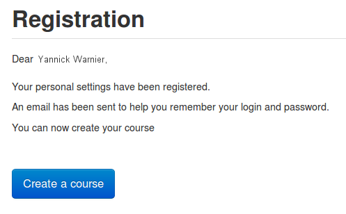 Once your account is created, a confirmation screen appears with a button suggesting you create a new course: