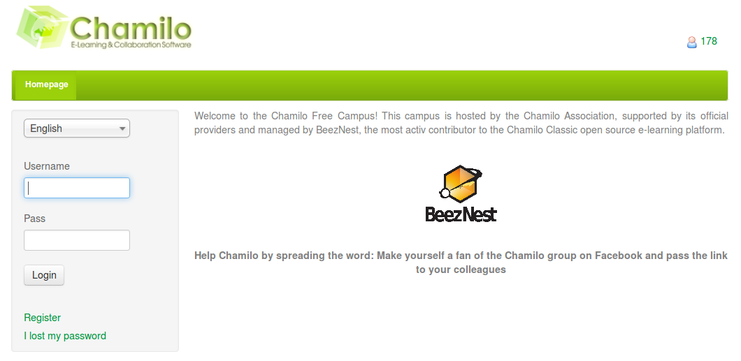 We will be referring to Chamilo’s Free Campus portal (or website) to show you the interface and introduce the key vocabulary used in Chamilo. Your first step should therefore be to go to the Chamilo Campus and register an account. The Chamilo Campus is a public portal hosted by the Chamilo Association specifically in order to to allow people to try out Chamilo. Your business or institution (e.g. a school) can set up its own Chamilo portal, which will essentially work the same way. Here’s how: