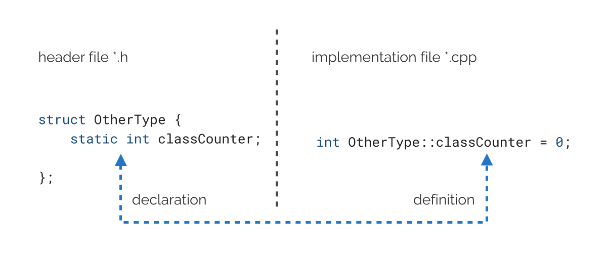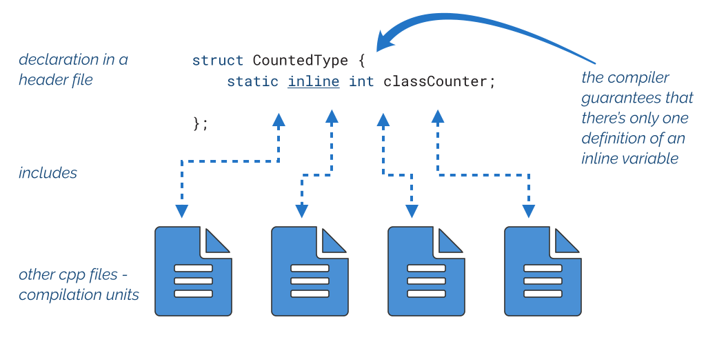 The code above declares classCounter inside CountedType, which is a static data member. The class is defined in a separate header file. Thanks to C++17, we can declare the variable as inline. Then, there’s no need to write a corresponding definition later. Without inline, the code wouldn’t compile.