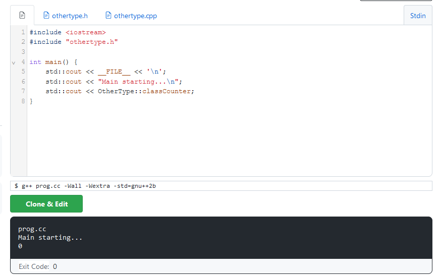 This time we also used Wandbox online compiler - as it’s easy to create and compile multiple files: