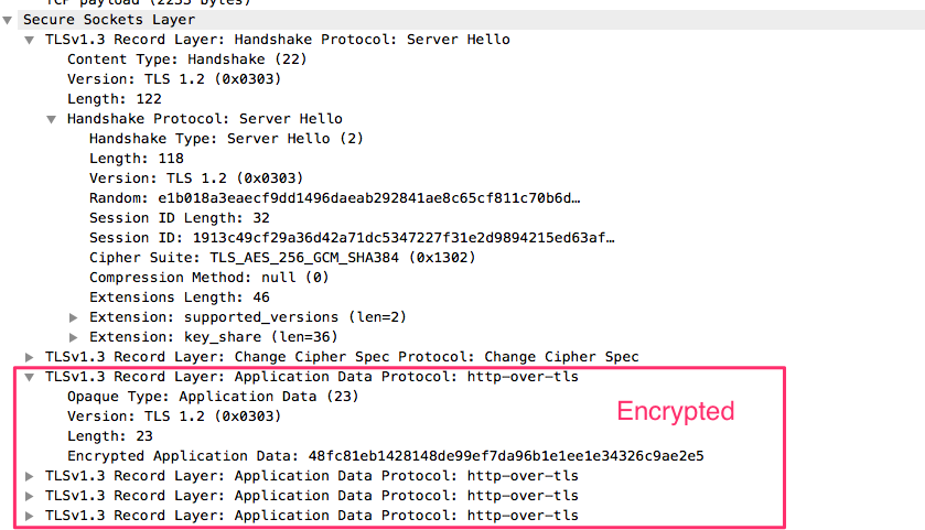 - All handshake messages after the ServerHello are now encrypted. The newly introduced EncryptedExtensions message allows various extensions previously sent in the clear in the ServerHello to also enjoy confidentiality protection.