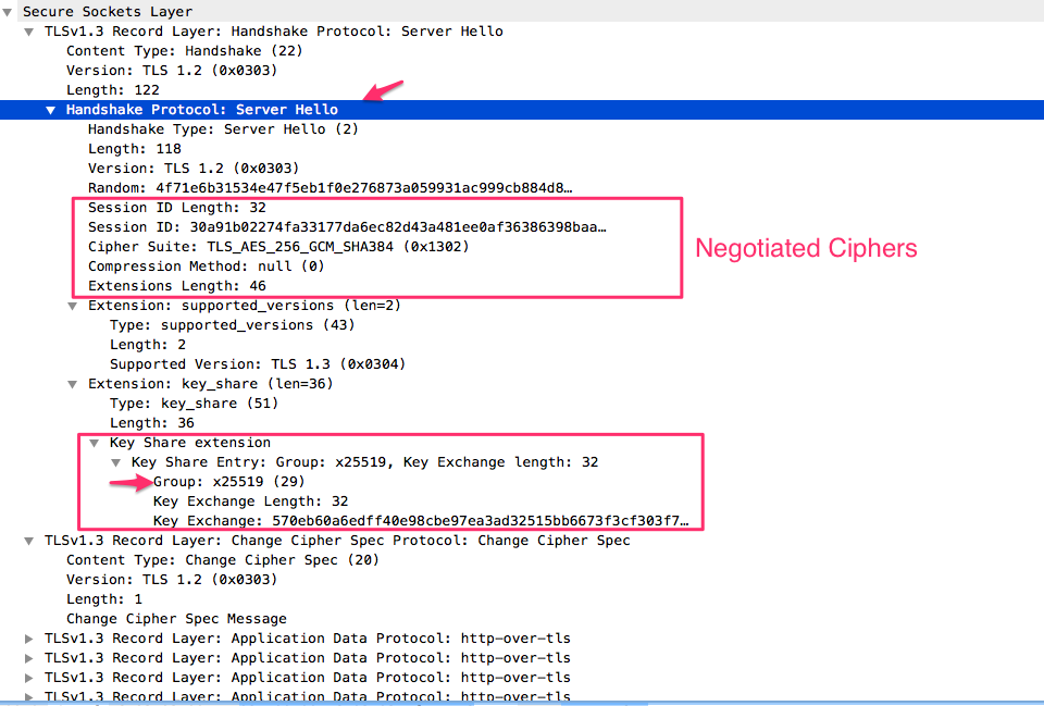 The “key_share” extension contains the endpoint’s cryptographic parameters.In TLSv1.3 the client selects a “groupâ€� that it will use for key exchange.