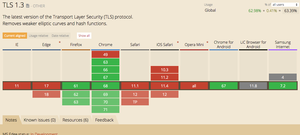 Checkout the browser compatibility for TLS 1.3 here : https://caniuse.com/#feat=tls1-3