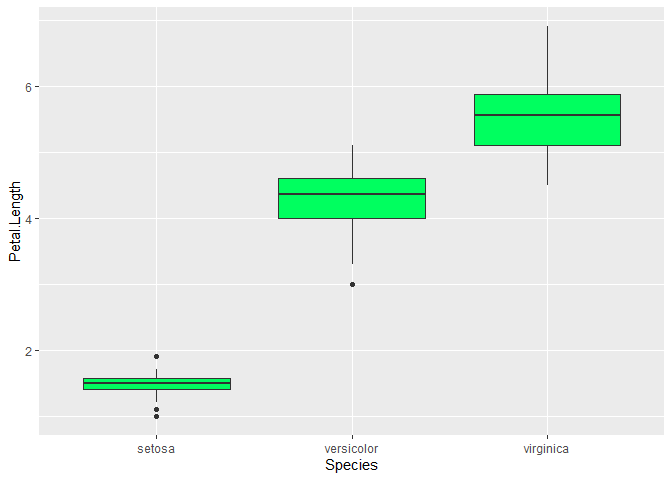ggplot(iris)+aes(Species,Petal.Length)+geom_boxplot(fill="#00ff5f")
