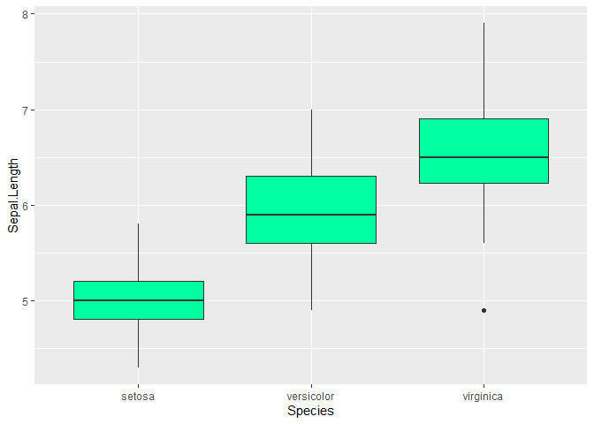 ggplot(iris)+aes(Species,Sepal.Length)+geom_boxplot(fill="#00ff9f")