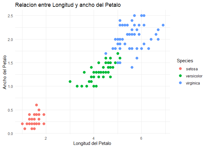labs(x = "Longitud del Petalo", y = "Ancho del Petalo", title = "Relacion entre Longitud y a\