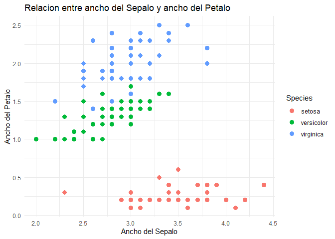 labs(x = "Ancho del Sepalo", y = "Ancho del Petalo", title = "Relacion entre ancho del Sepal\