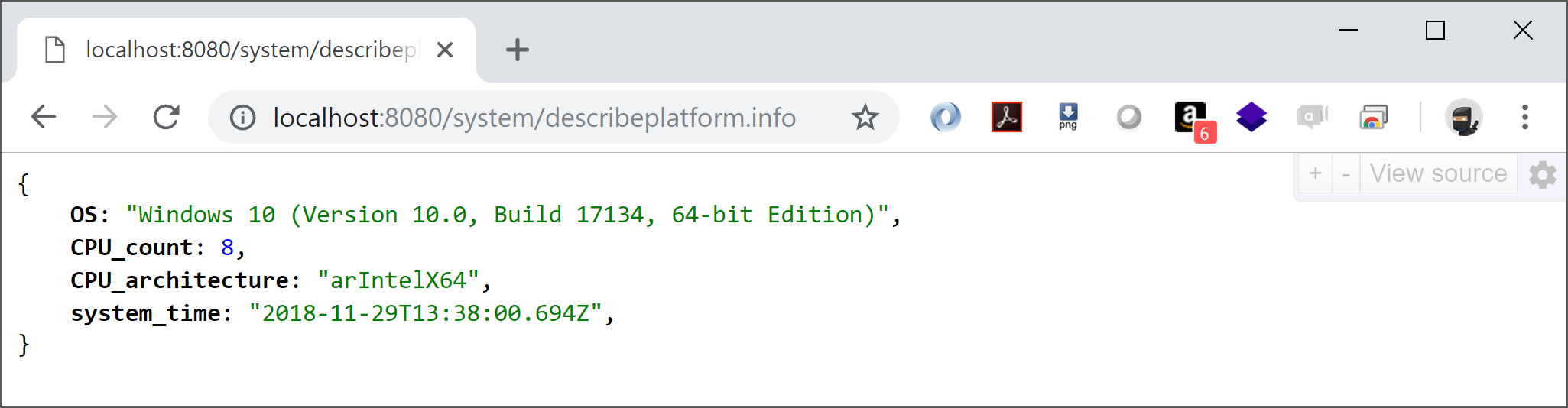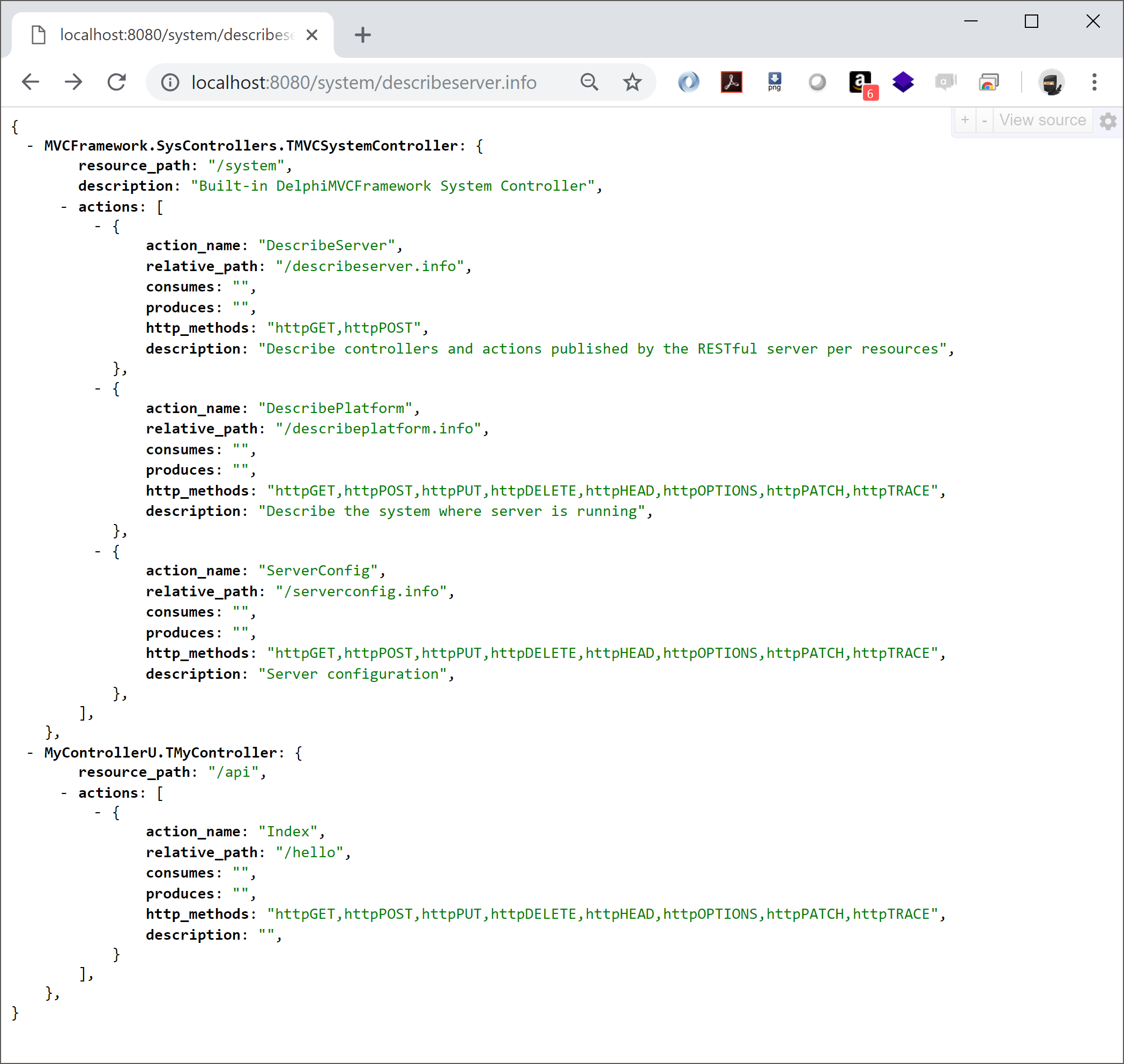 Nosso pequeno exemplo Hello World já contém algumas características interessantes chamadas System Actions. Pronto, todo projeto DMVCFramework sempre conterá embutido um TMVCSystemController automaticamente registrado. Este controller entrega algumas informações bastante úteis. Todos os system actions são invocáveis somente via localhost e você pode decidir remover completamente o controller de sistema (verifique o Capítulo 13: Dicas e truques). Todas os System Actions provém somente respostas JSON - outros formatos não são suportados até o momento.