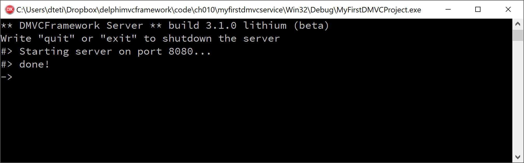 - Sim! O console DMVCFramework padrão da aplicação está rodando e servindo seu primeiro servidor DMVCFramework. Simples, não?