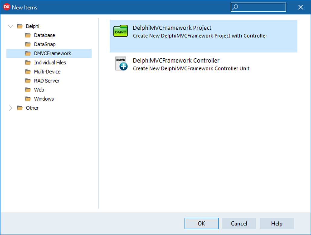 Delphi->DMVCFramework->Delphi MVC Framework Projectas shown below;