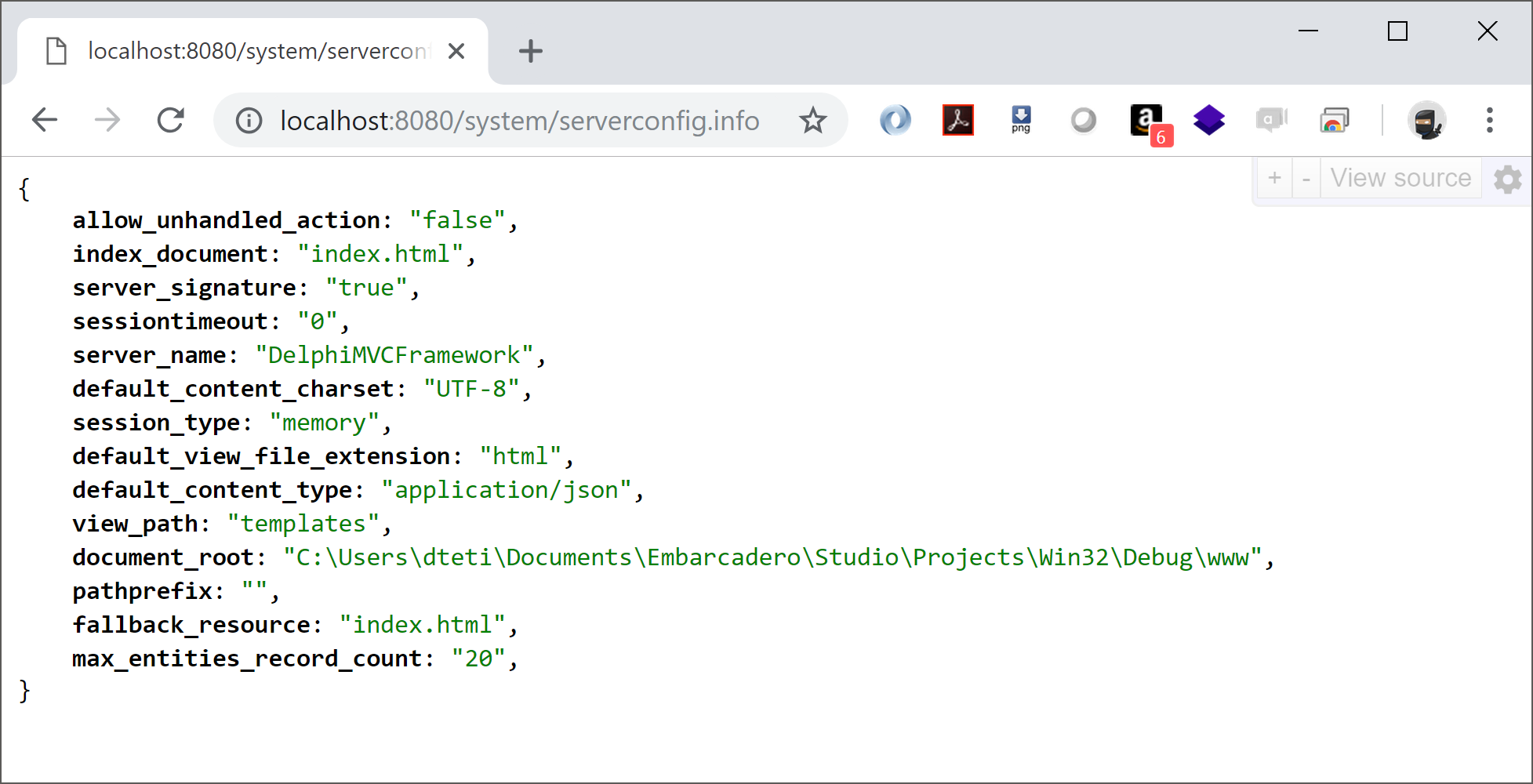 Our small Hello World already contains some interesting features called System Actions. That’s it, every DMVCFramework project always contains an automatic registered TMVCSystemController . This controller provides some useful information. All the system actions are invokable only by localhost and you can also decide to completely remove the system controller (check Chapter 16: Tips and Tricks). All the System Actions provide only JSON responses - no other formats are supported at this time.