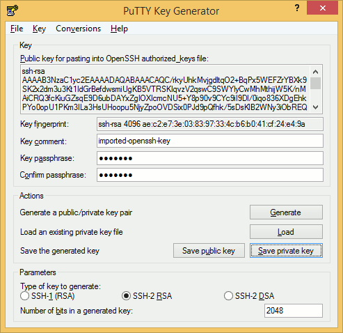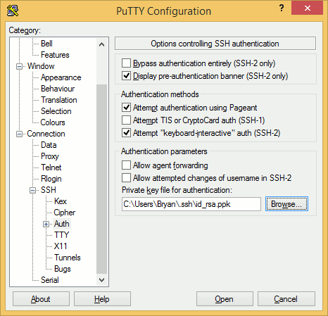 These commands will create the .ssh folder and open the authorized_keys file in an editor, in this case nano. Open your public key (typically C:\Users\username\.ssh\id_rsa.pub) in a text editor (Notepad should be ok), copy it’s contents to clipboard, and in the terminal, right-click the window title -> Edit -> Paste. Press Ctrl-O and Enter to save then press Ctrl-X to quit nano.